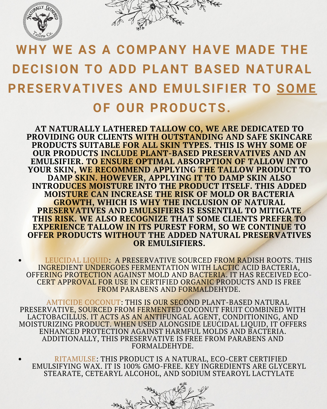 Ingredients: Locally sourced hand rendered Beef Tallow, Organic Jojoba Oil, Organic Shea Butter, Organic Beeswax, Leucidal Liquid, AMTicide Coconut, Ritamulse, Lavender Essential Oil, Arrowroot Powder, Vitamin E Oil